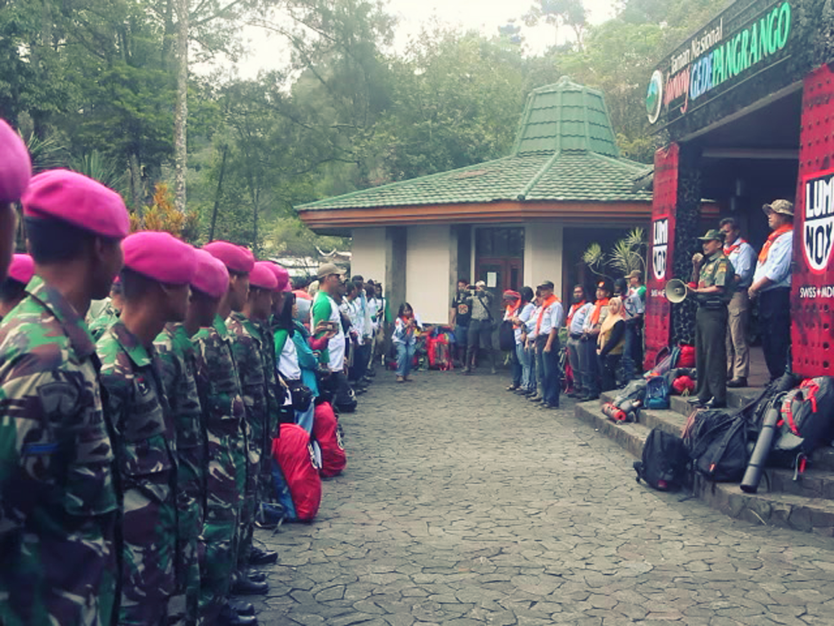Cibodas, 28 Oktober 2017. Bertempat halaman depan kantor di Balai Besar Taman Nasional Gunung Gede Pangrango (TNGGP), telah dilaksanakan Upacara Pendakian TRAMP Bersih Gunung dan Konservasi 2017 memperingati “Sumpah Pemuda” dengan tema “Menuju Zero Plastik 2018 Gede Pangrango”. Kegiatan ini diikuti sebanyak 200 peserta yang terdiri dari unsur pelajar, organisasi pendaki gunung, marinir, dan masyarakat umum. Kegiatan ini diawali dengan adanya salah satu anggota TRAMP tahun 1977 yang kecelakaan saat mendaki di Puncak Gunung Pangrango, maka untuk mengenang hal tersebut TRAMP mencanangkan Program Pendakian Sumpah Pemuda Bersih Gunung dan Konservasi hingga saat ini dan melibatkan peserta dari luar dalam pelaksanaannya. Operasi bersih gunung ini dilakukan selama dua hari yaitu tanggal 28 s/d 29 Oktober 2017 dan terbagi menjadi 30 regu, dengan route pembersihan start jalur Cibodas dan finish Alun – Alun Mandalawangi Gunung Pangrango.