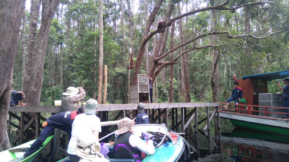Pangkalan Bun (22/5/17). Sebagai bagian dari upaya konservasi satwa liar, SKW II BKSDA Kalimantan Tengah bersama OFI (Orangutan Foundation Internasional) kembali melakukan pelepasliaran 4 individu Orangutan di Camp Filomena Taman Nasional Tanjung Puting, Kab. Kotawaringin Barat pada Senin 22 Mei 2017. Keempat orangutan merupakan hasil penyerahan masyarakat dan sitaan BKSDA dengan 2 individu orangutan jantan berumur 13 tahun dan 2 individu orangutan betina berumur 9.5 th.
