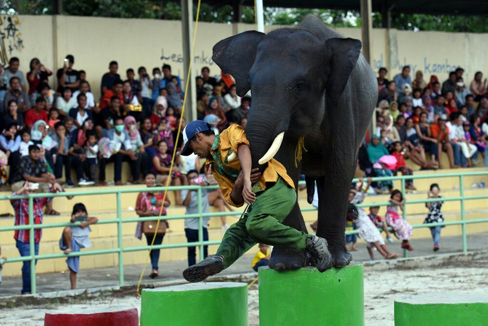 Rangkaian atraksi gajah yang ditampilkan di area gedung atraksi Pusat Latihan Gajah TN Way Kambas, dengan dipandu oleh pemandu acara dimulai dengan tampilnya 10 ekor gajah atraksi, yang keluar beriringan bergandengan, ujung ekor gajah yang didepan dipegang dengan belalai gajah yang barada dibelakangnya, layaknya manusia bergandengan tangan. Sebagai tanda simbolis rangkaian atraksi gajah, seekor gajah bertugas menarik tali bendera untuk dikibarkan di tiang bendera dengan gajah-gajah lainnya berbaris memberi hormat bendera, dan kemudian juga memberi salam hormat kepada penonton, seperti apel bendera saja. Berbagai atraksi ketrampilan ditunjukan oleh gajah-gajah ini, antara lain, berdiri berputaran diatas tunggak beton diameter 60 cm, berdiri dengan dua kaki diatas tunggak, juga menggendong sang pawang dengan belalai sambil berputar diatas tunggak.